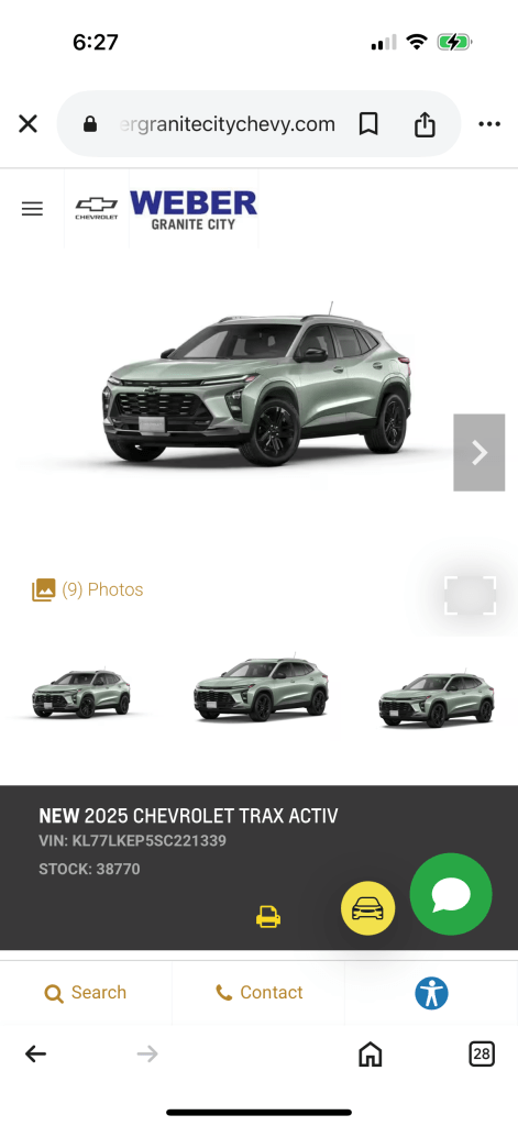 Yesterday I finally heard from my insurance company to advise me what my pitiful, beat up Prius was worth. The figure was more than I was expecting, for which I am grateful. As soon as I had a final number I called my now friend and salesman, Keith, at Weber Chevrolet. I had spent a couple of hours with him on Wednesday after my intuition told me to check out a small SUV, a Chevy Trax. I test drove what is to become my car today, and I tell you, it had me at “heated steering wheel”. That seems like such a luxury, especially since I have a circulatory condition where my hands get cold and numb and turn a yellow color. Anyway, the car has a lot of features, surprisingly, for its price. It gets pretty good reviews.